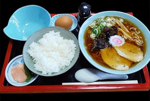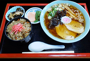 ![]() 飛騨高山鳳凰らーめん 飛騨牛味めしセット (鳳凰らーめん並・飛騨牛味めし・小鉢・漬け物) 1,330円(税込み) ※飛騨牛の炊き込みご飯です |